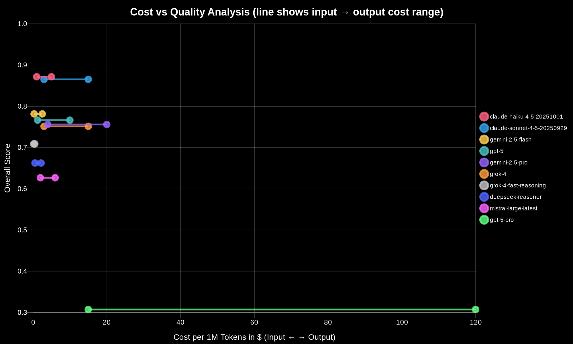 And then there’s GPT-5-Pro. Remember that model that couldn’t complete half its evaluations? The one with zero scores in pattern recognition and recommendations? That one costs almost 68 dollars per million tokens. Fifteen dollars for input, a hundred and twenty dollars for output. It’s so ridiculously expensive compared to everything else that it actually screwed up my cost-versus-quality graph.