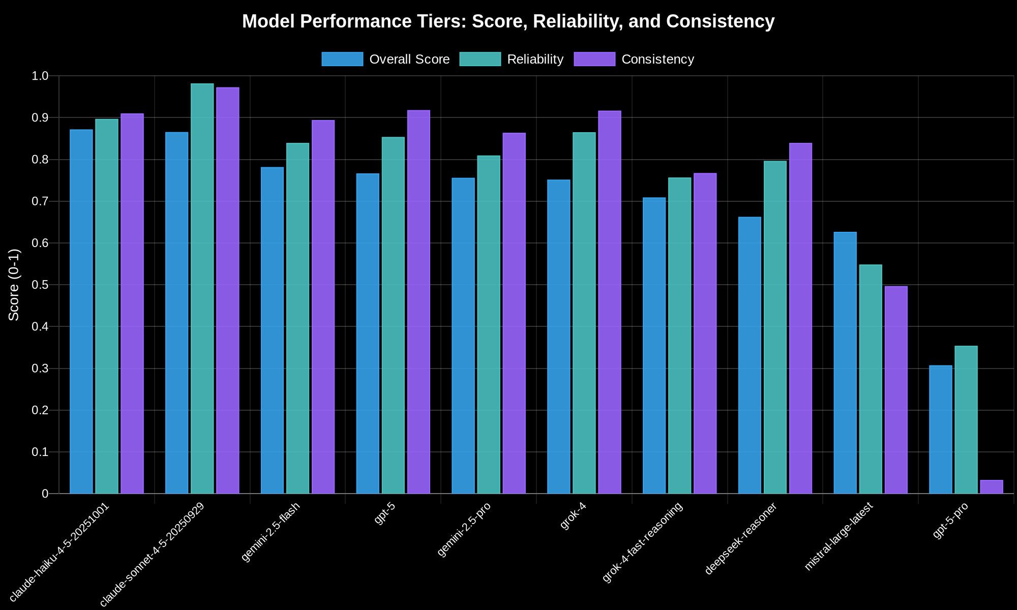 And then we have the top tier. What’s interesting is that the data naturally separated into these groups. There’s a real performance gap between the mid-tier models clustering around 75% to 80% and the top performers. The top tier models consistently score above 85% overall with significantly higher reliability and consistency scores. They’re not just a little better - they’re noticeably better across the board.