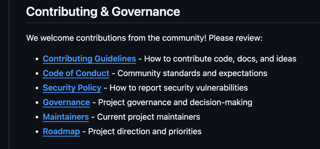 - ✓ governance: All 6 governance files exist (MAINTAINERS.md, GOVERNANCE.md, ROADMAP.md, SUPPORT.md, CODE_OF_CONDUCT.md, CONTRIBUTING.md)