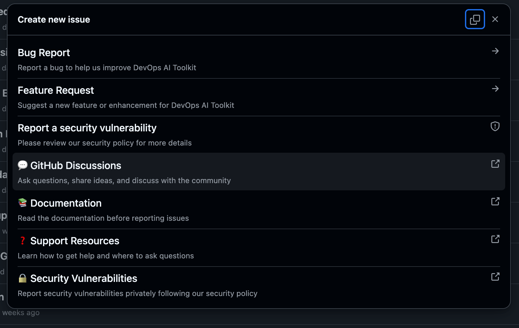 Notice what appears: instead of just a blank issue form, I get a menu with multiple options. There are links to GitHub Discussions for questions, Documentation, Support Resources, and Security Vulnerabilities reporting. This is exactly what I was talking about: guiding people to the right place before they even start typing.