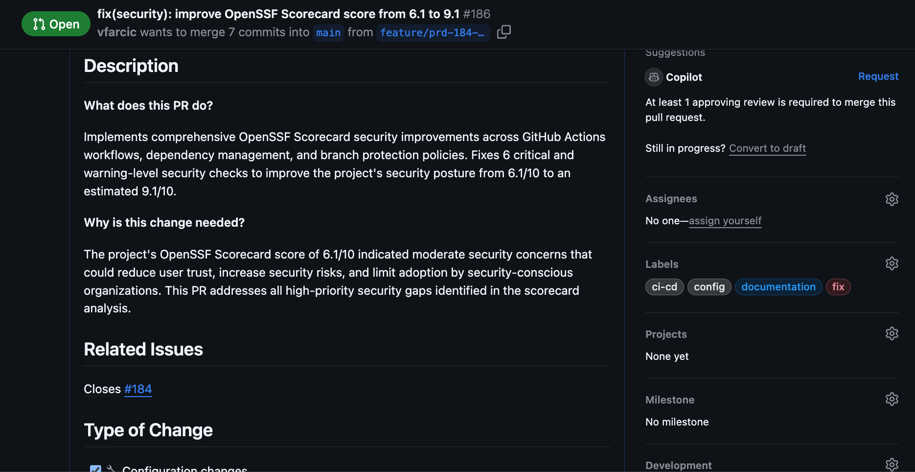 sync-labels: trueThe labeler configuration maps file paths to labels. Changes to docs get labeled “documentation”, changes to workflows get “ci-cd”, changes to tests get “tests”, and so on. The GitHub Actions workflow runs on every PR and applies the labels automatically. Now your release notes are organized without anyone having to remember to add labels manually.