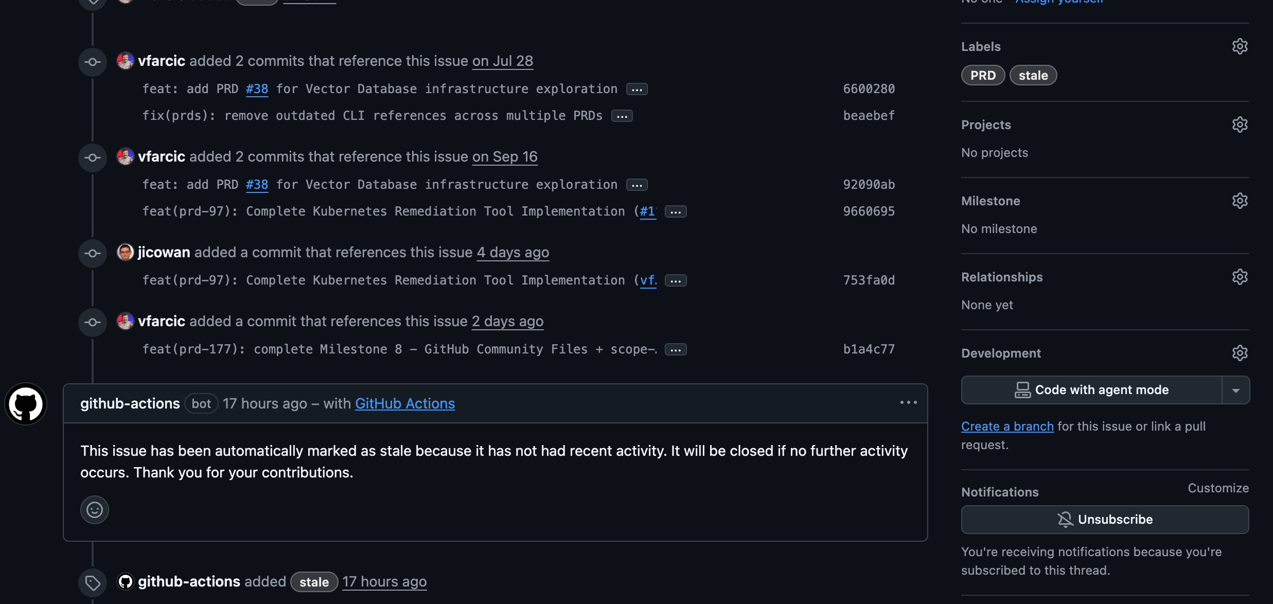 operations-per-run: 100The workflow runs daily, checking for issues with no activity for 60 days and PRs with no activity for 30 days. It marks them stale, gives people 7 days to respond, and then closes them. Important: the configuration exempts issues with certain labels like “security” or those assigned to milestones. You don’t want to close things that actually need attention just because they’re waiting on maintainers.