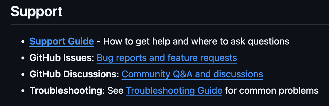 A Support section in the README points people to the right resources: where to ask questions, how to report bugs, where to discuss ideas. This keeps everything organized and prevents people from opening issues when they should be asking in discussions or reading the docs.
