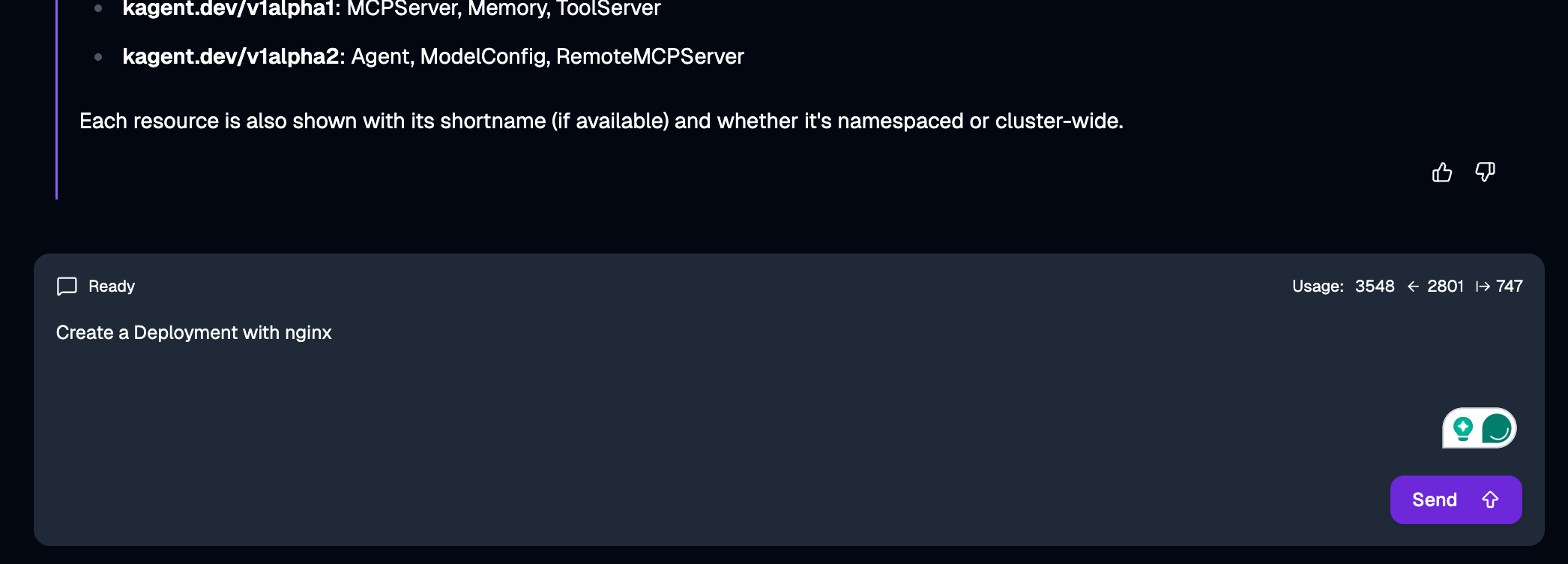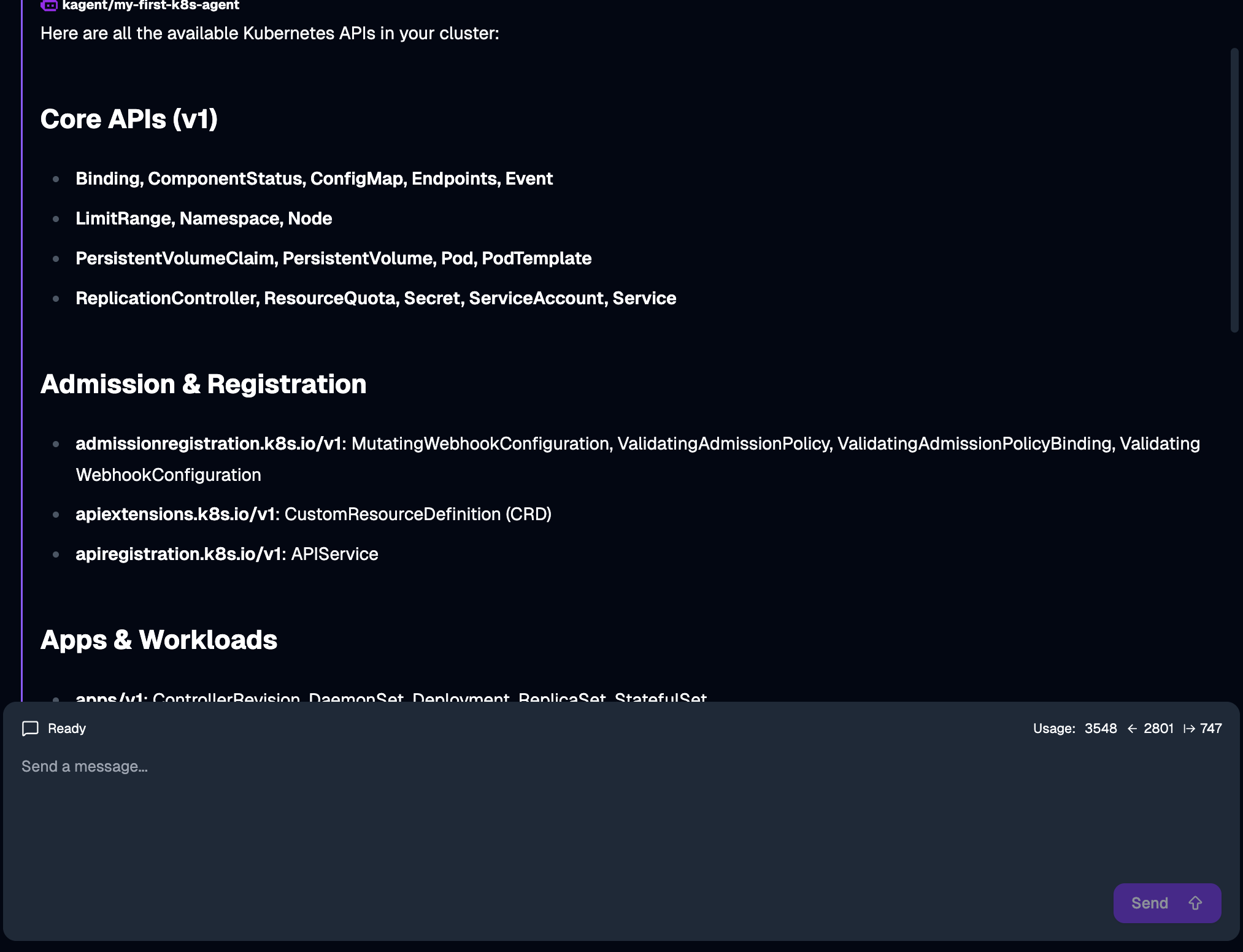 Now we can interact with the agent through a chat interface. You type questions in natural language, and the agent decides which tools to use to answer. We’re asking it to show all available Kubernetes APIs.