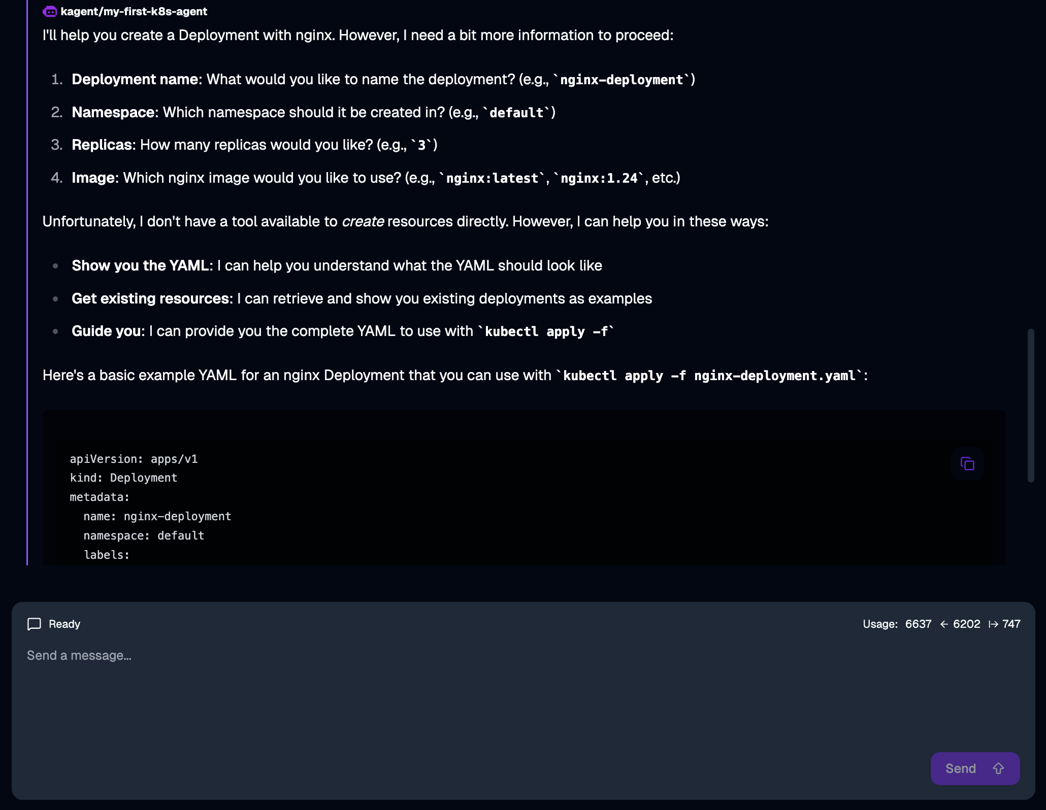 Well, not quite. The agent asks for more details about the deployment, but then admits it doesn’t have a tool to create resources directly. It can only show you the YAML and guide you through using kubectl apply.