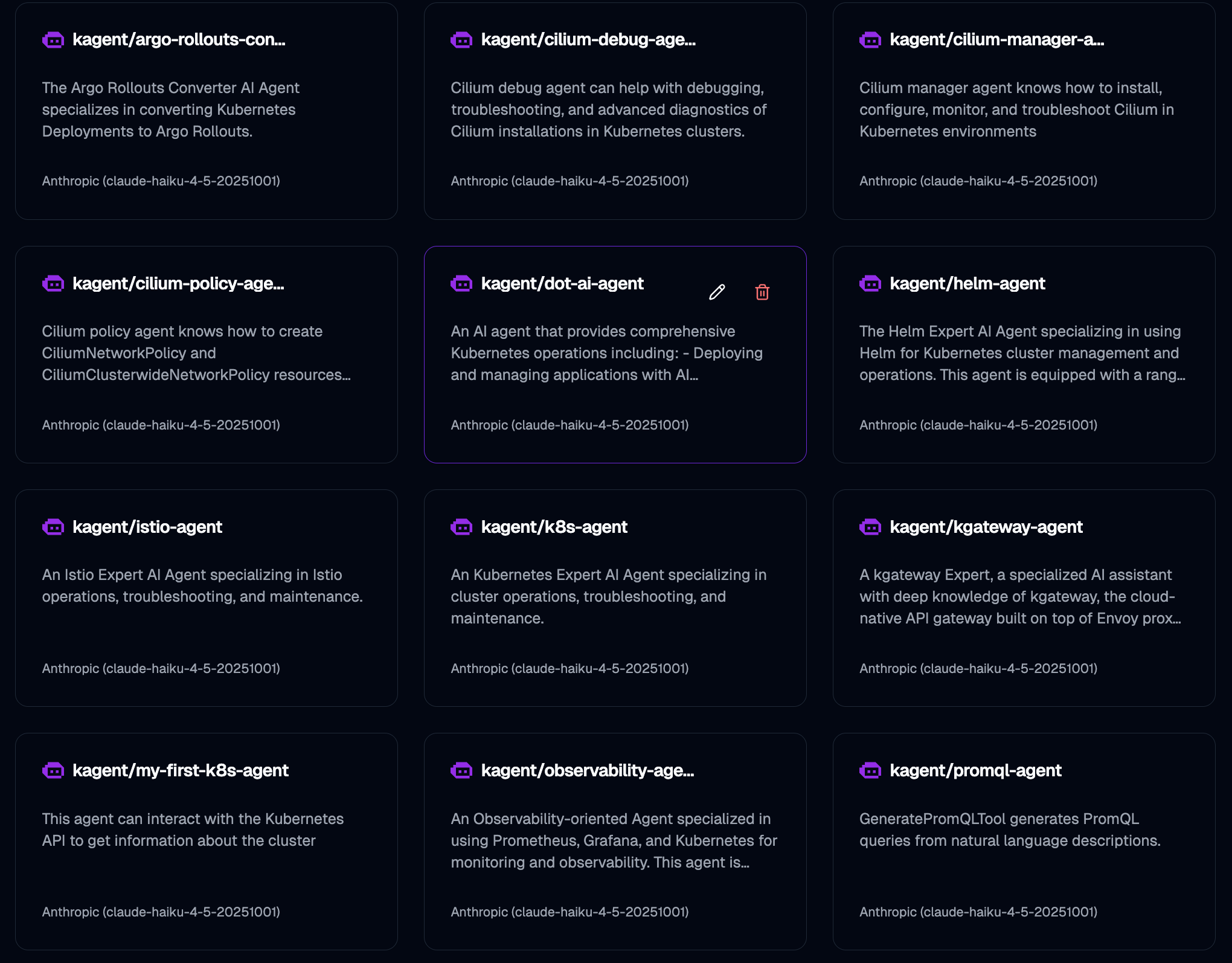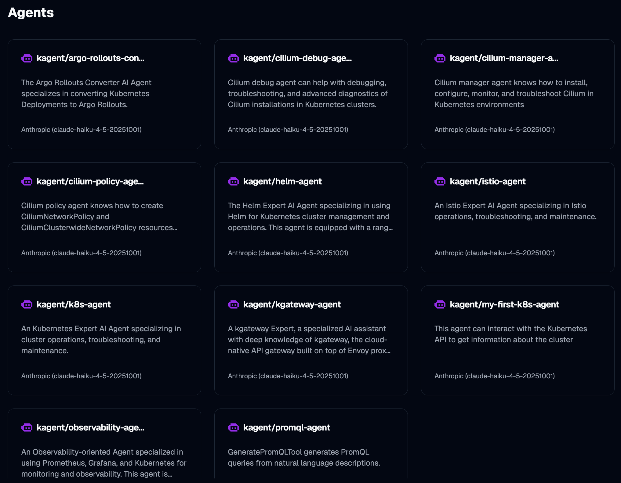 Once created, we’re back at the agents list where we can see our new agent alongside several pre-built ones that come with kagent. There are agents for Argo, Cilium, Helm, Istio, Kubernetes, observability, and more. These give you a starting point if you don’t want to build your own from scratch.