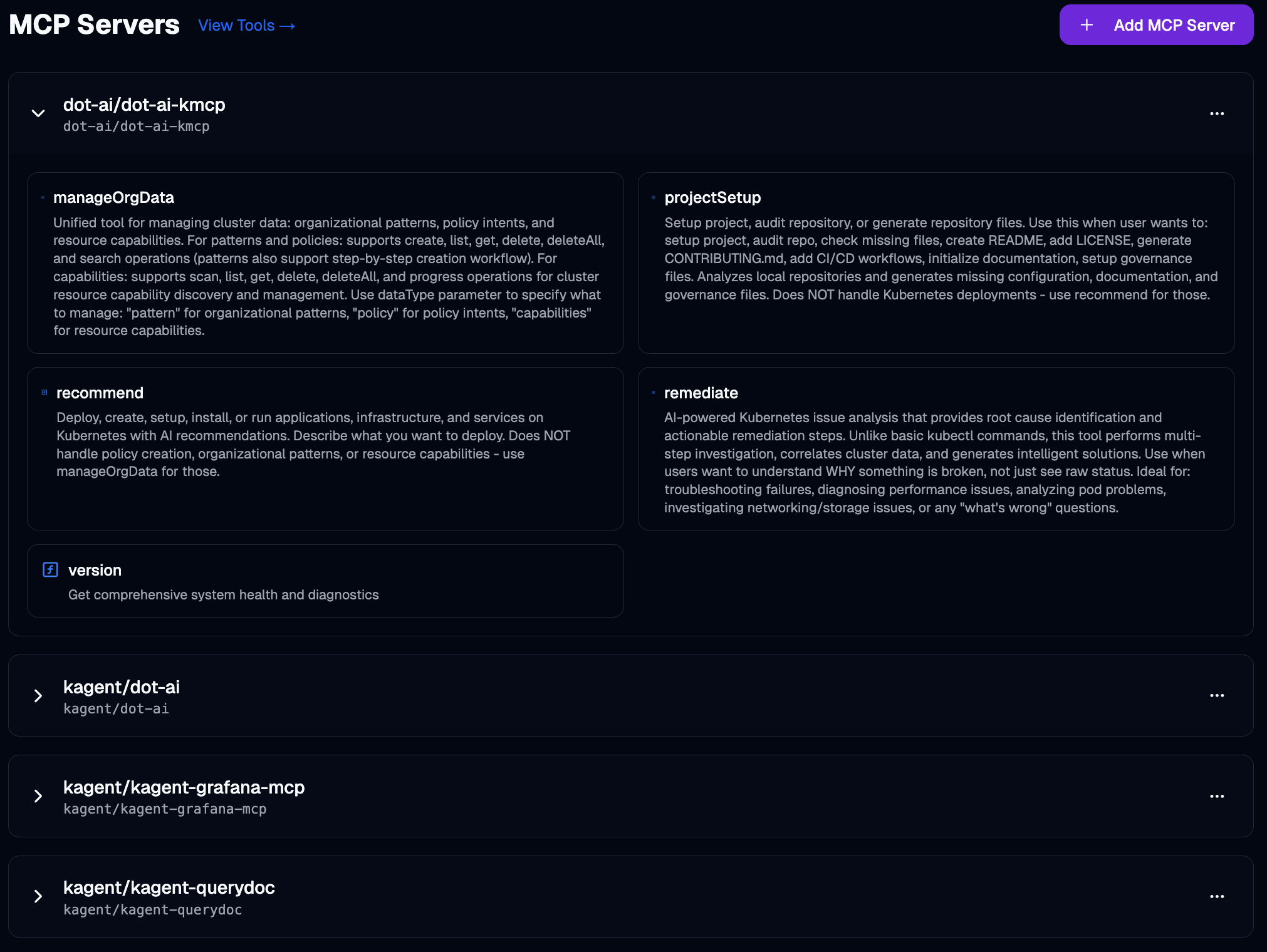 If we look at kagent’s MCP Servers page, we can see the dot-ai-kmcp server showing up with all its available tools listed: manageOrgData, projectSetup, recommend, remediate, and version. kmcp successfully deployed the MCP server and made it available.