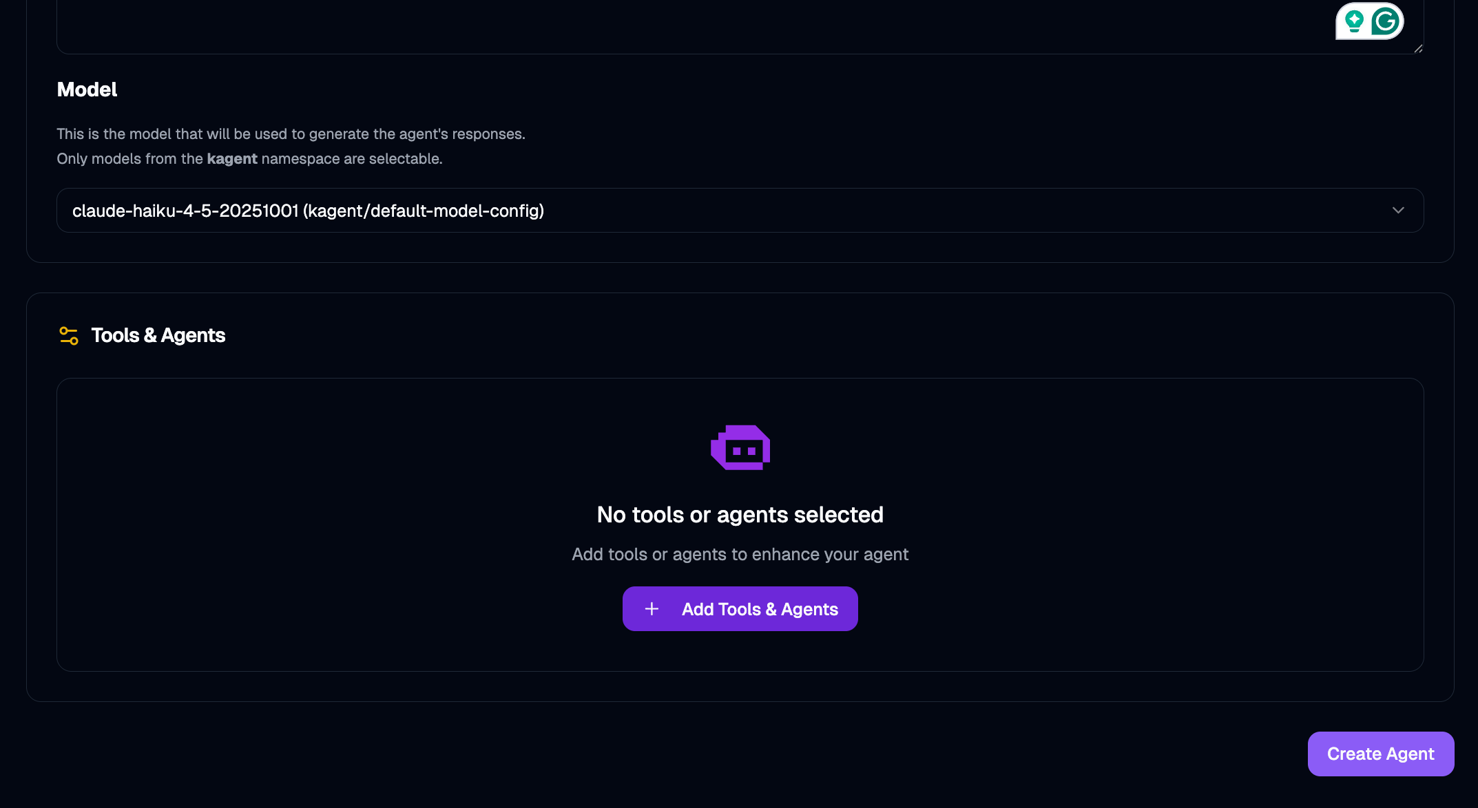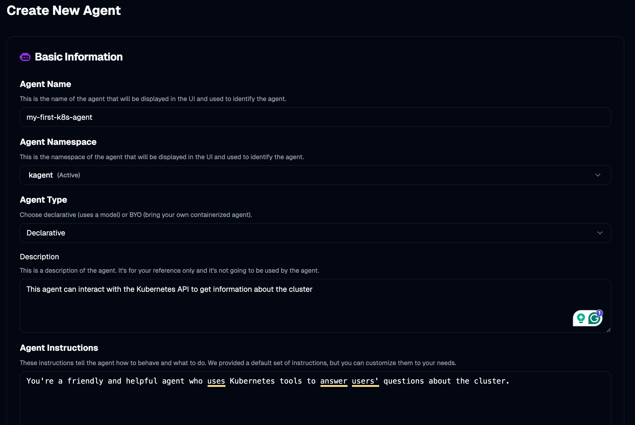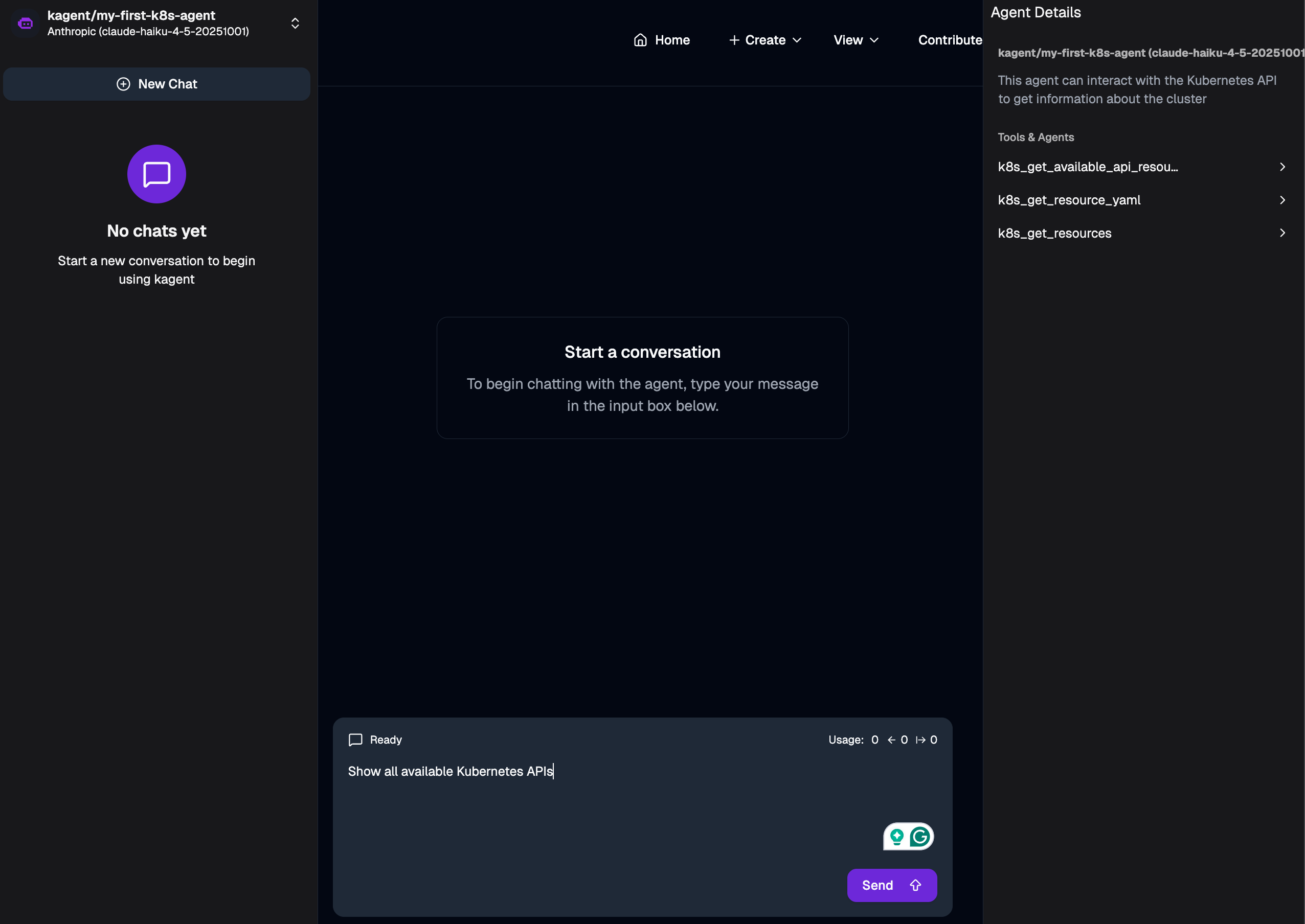 my-first-k8s-agentas the Agent Name, selectkagentas the Agent Namespace,This agent can interact with the Kubernetes API to get information about the clusteras the Description, andYou're a friendly and helpful agent who uses Kubernetes tools to answer users' questions about the clusteras Instructions (System Prompt), and selectclaude-haiku-4-5-2025-1001as the Model.