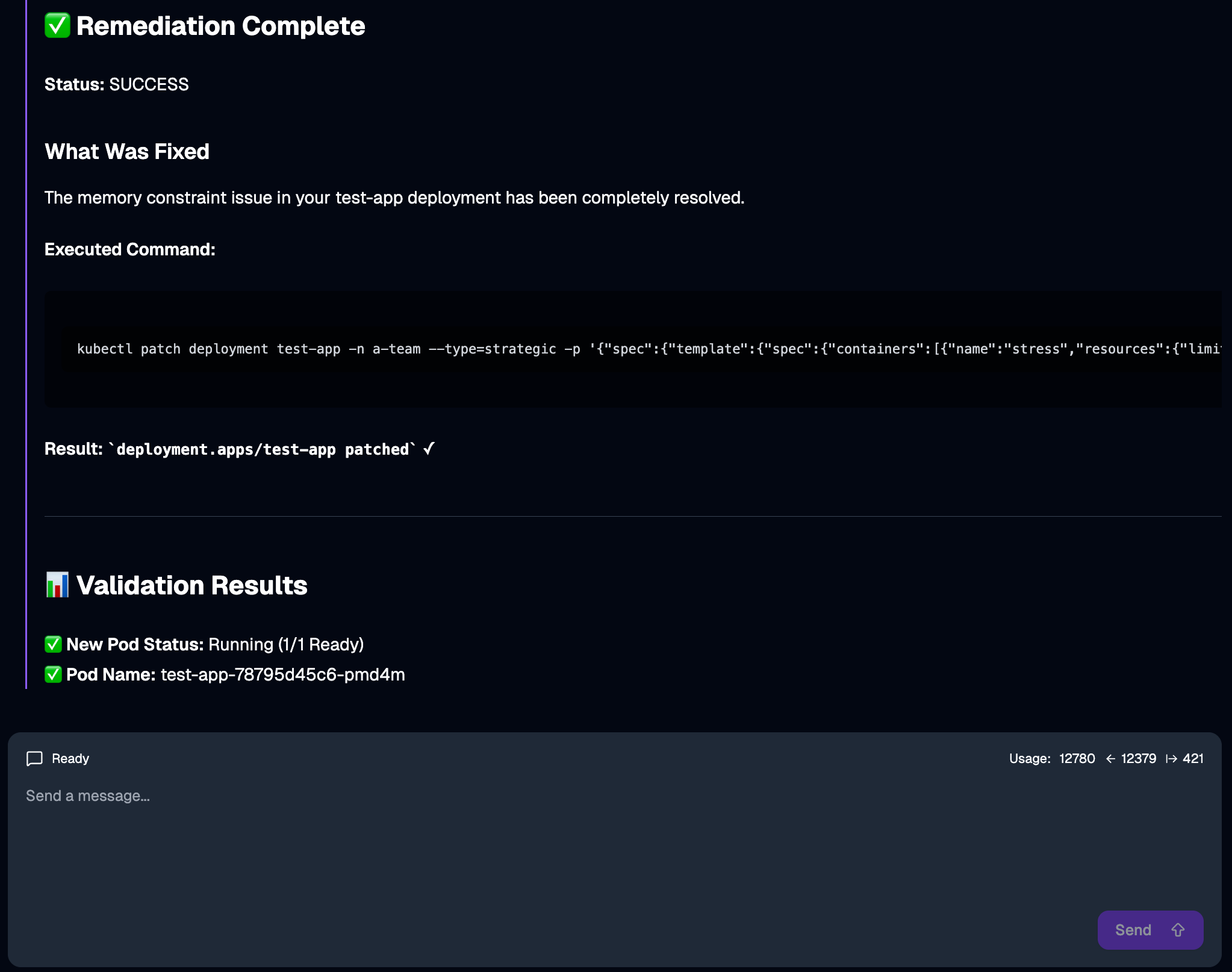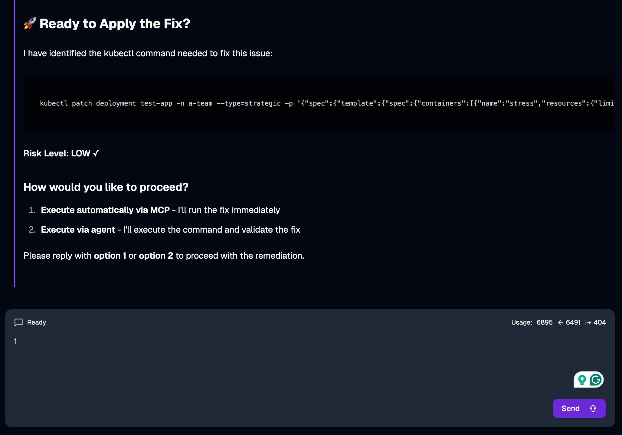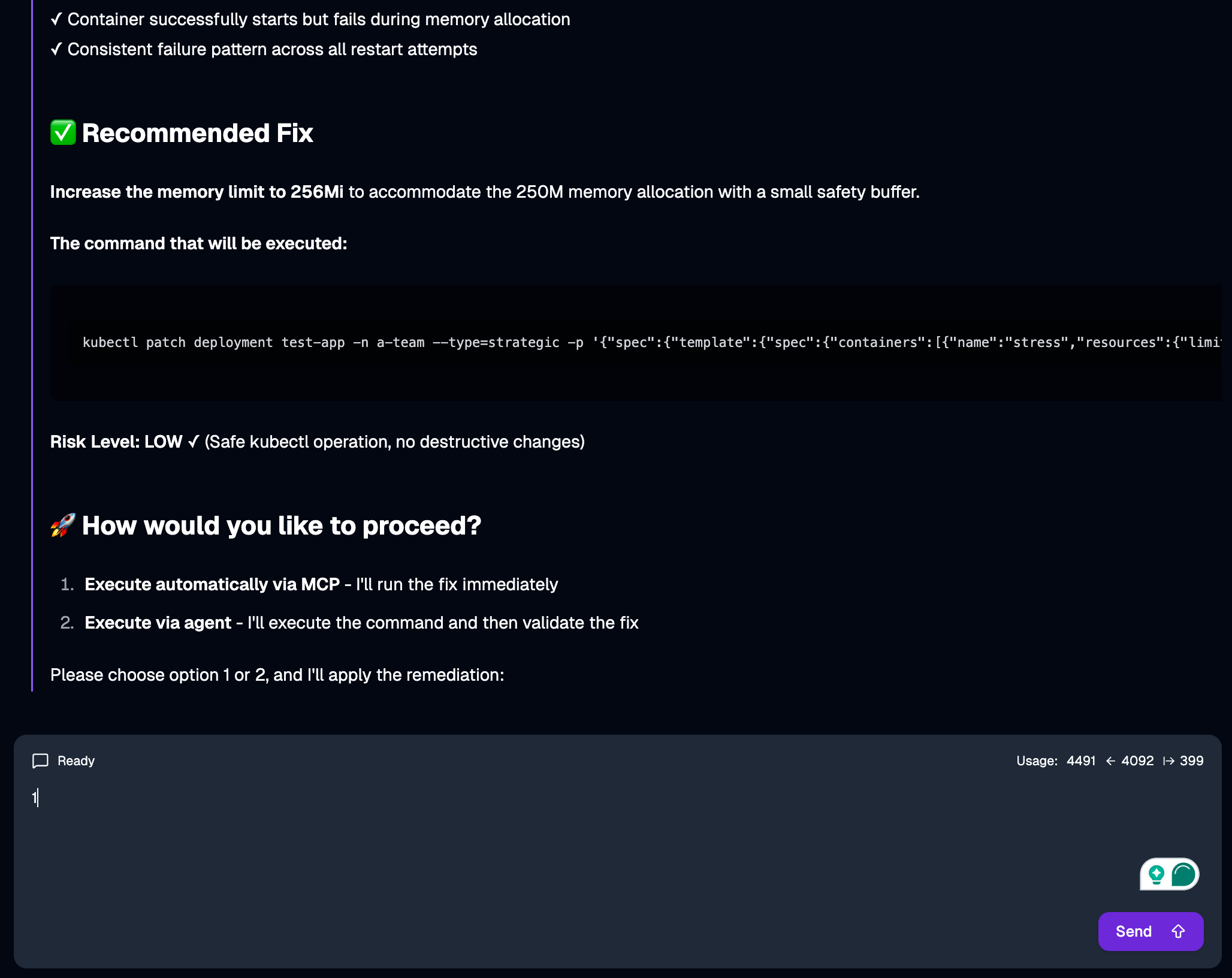 test-app-996475b7d-mfnnz 0/1 CrashLoopBackOff 8 (5m5s ago) 22mIt’s in CrashLoopBackOff, which means something is wrong and we need to figure out what. This is a perfect scenario for an agent with troubleshooting capabilities.