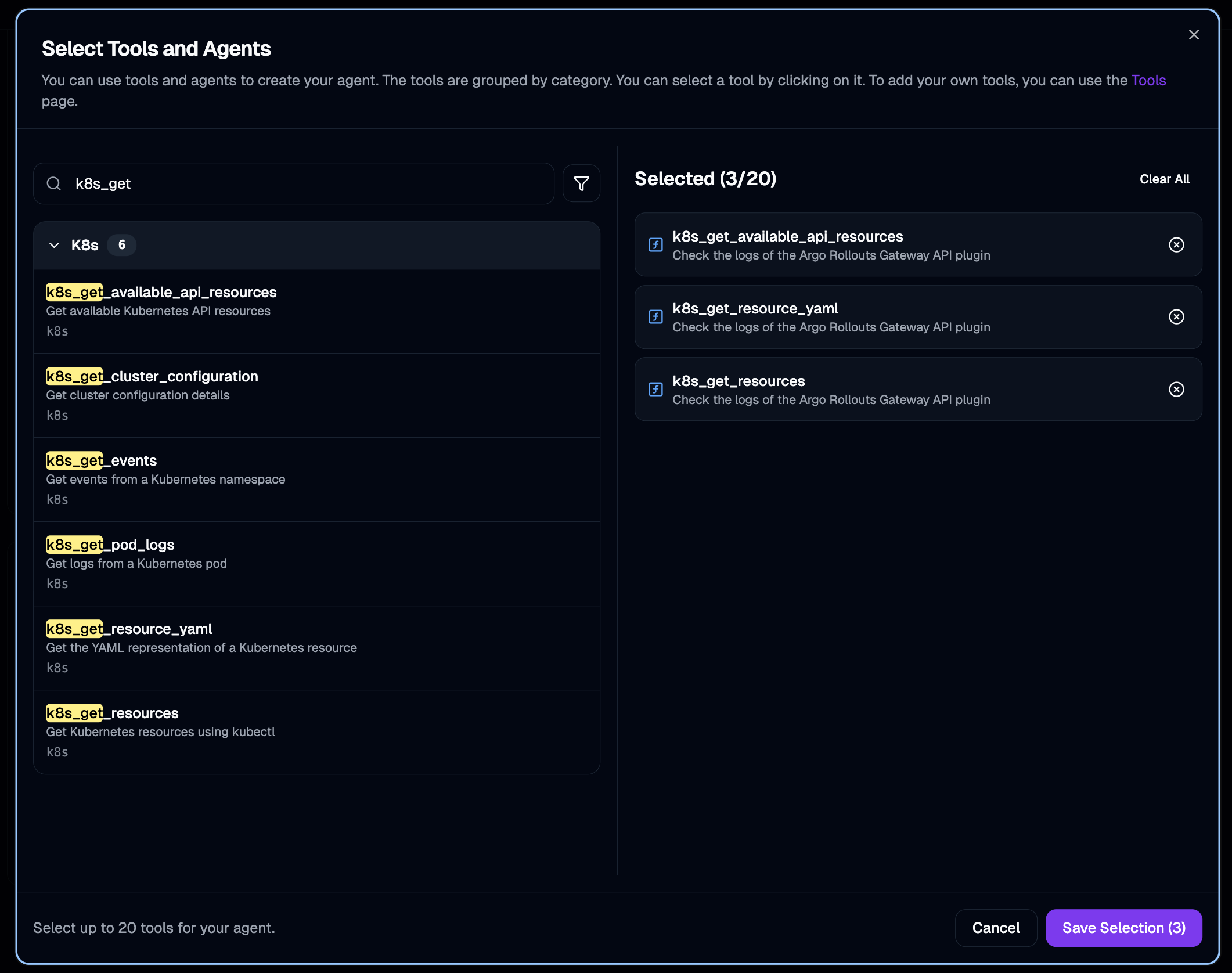 + Add Tools & Agentsbutton, selectk8s_get_available_api_resources,k8s_get_resources, andk8s_get_resource_yamltools, and click theSave Selectionbutton.